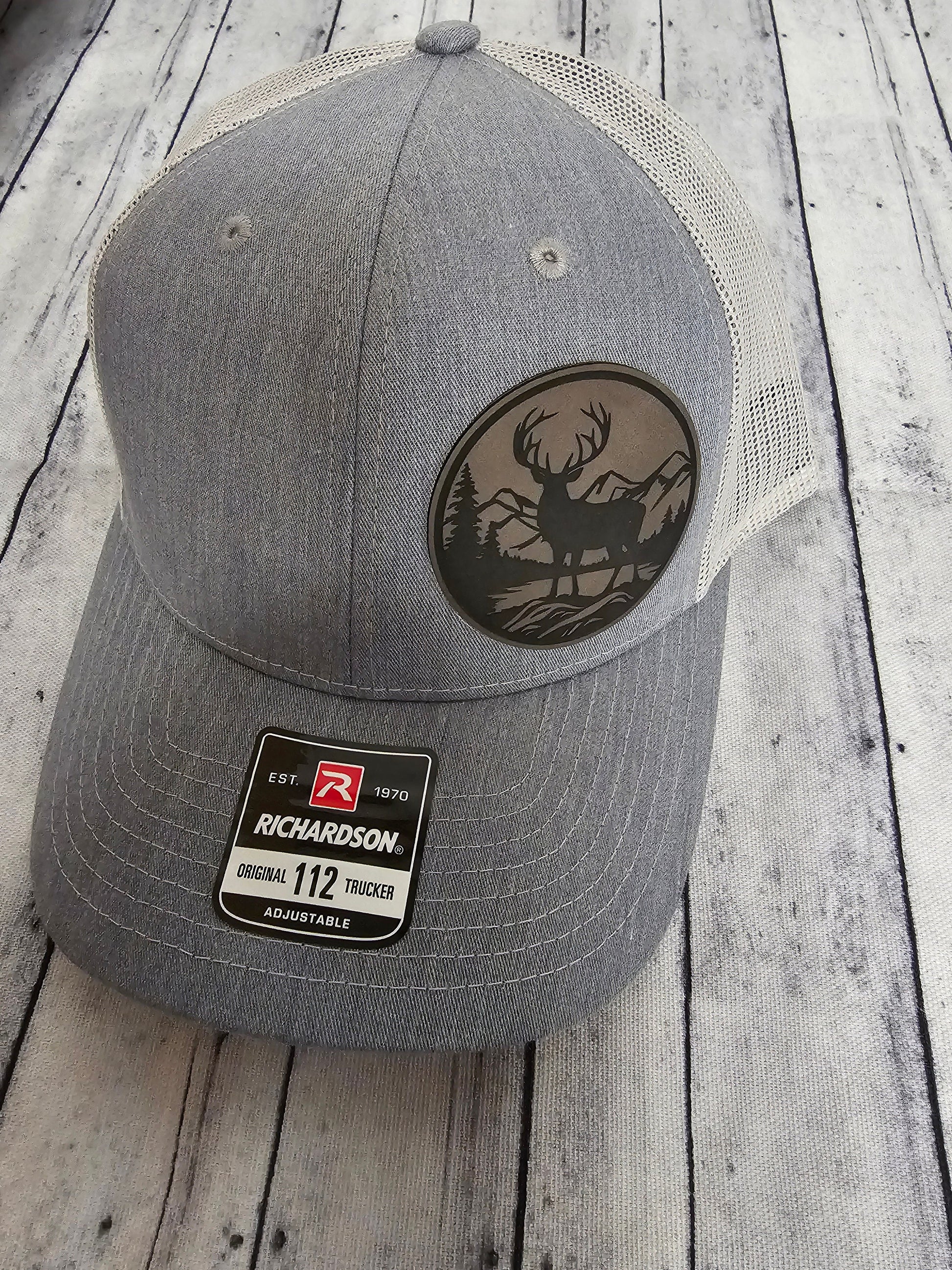 This listing is for Richardson 112 in grey with a leatherette patch in the color grey and black.