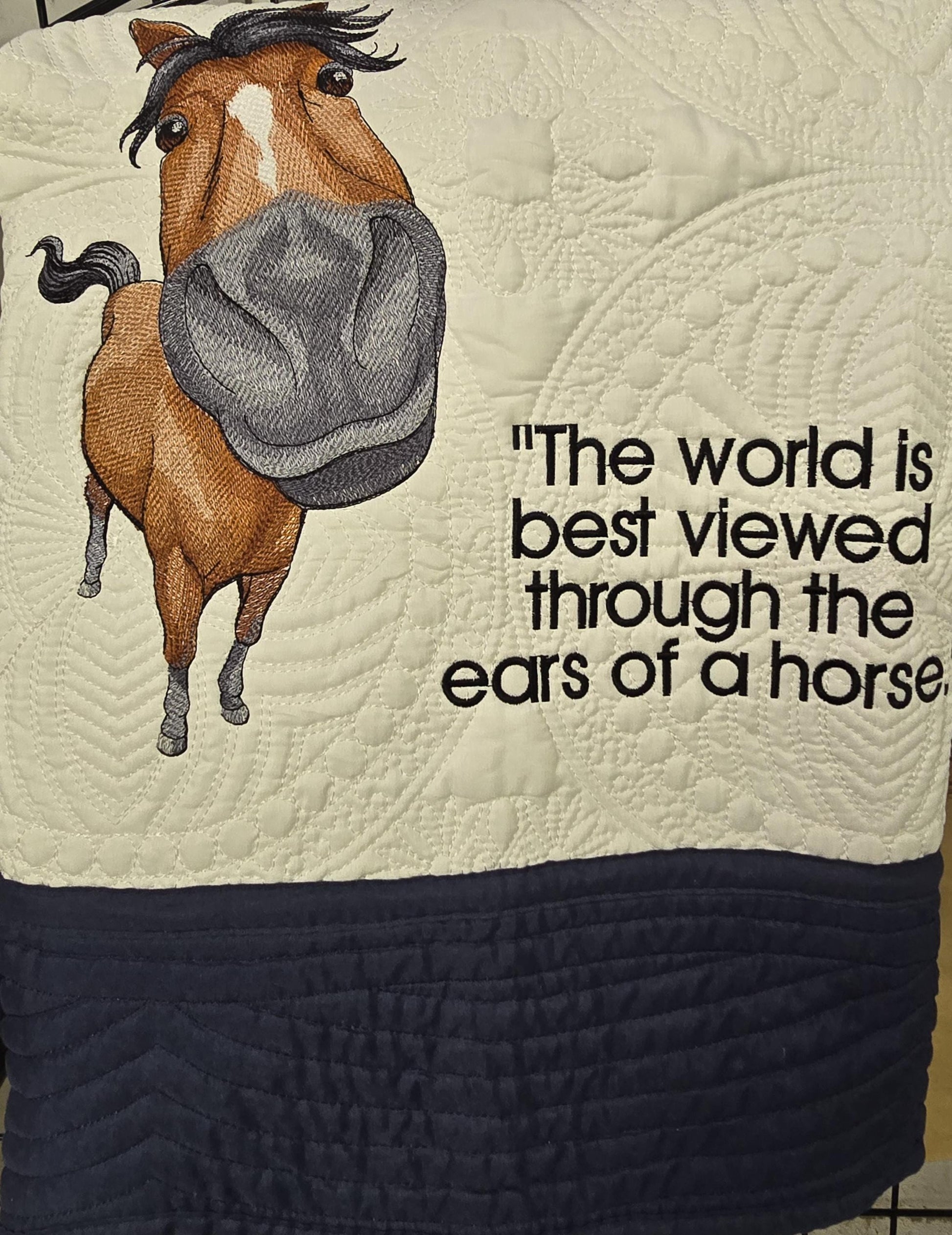 Quilt with Horse and saying "The World is best viewed through the ears of a Horse" for a Youth or Adult horse lover warm quilt blanket.