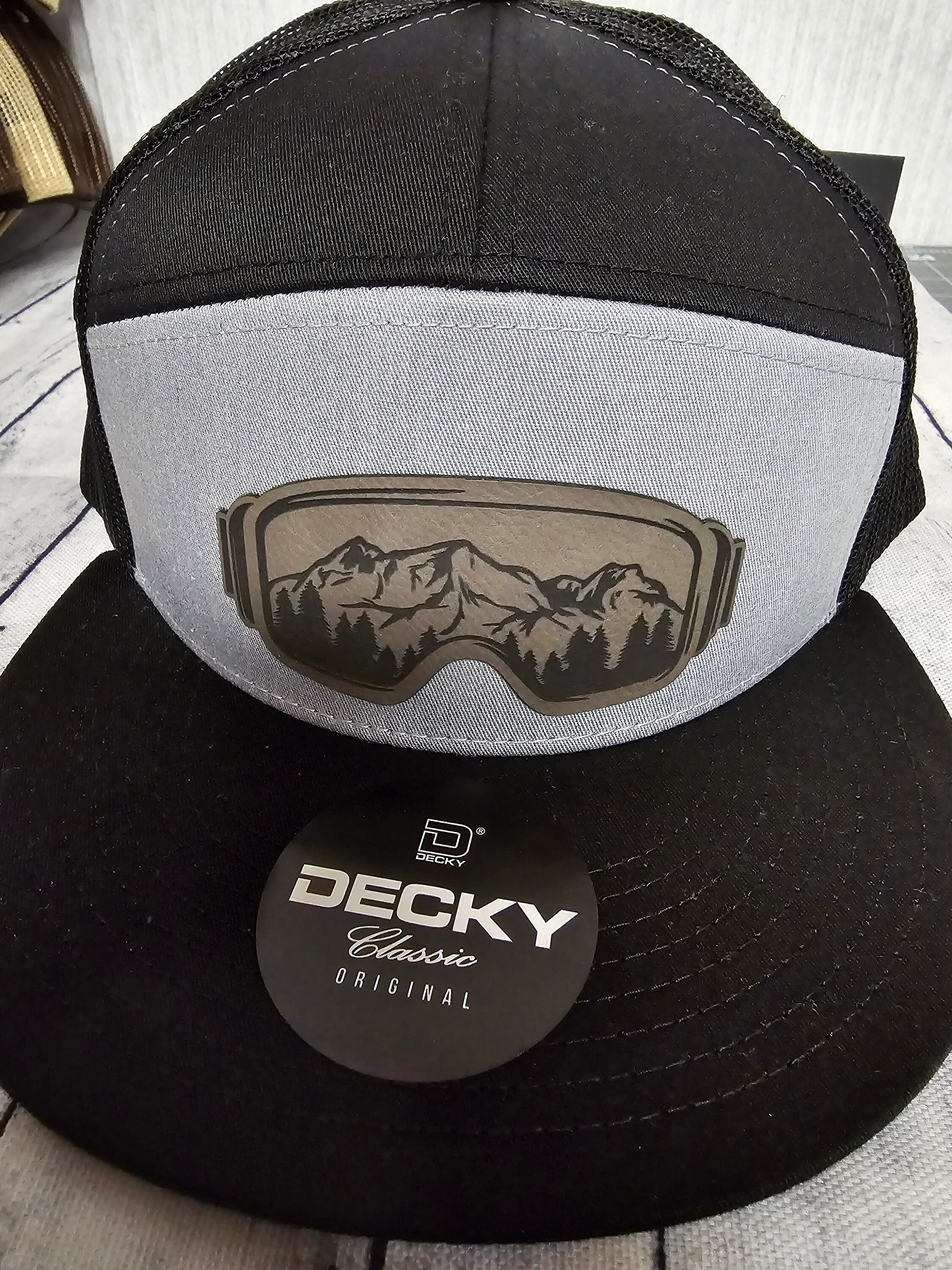 The laser-engraved leather patch masterfully captures the rugged silhouette of towering mountains, offering a glimpse through the lens of adventure goggles. The intricate details bring the alpine scene to life, making the Summit Vision Cap a wearable work of art that resonates with those who seek the exhilaration of the great outdoors.